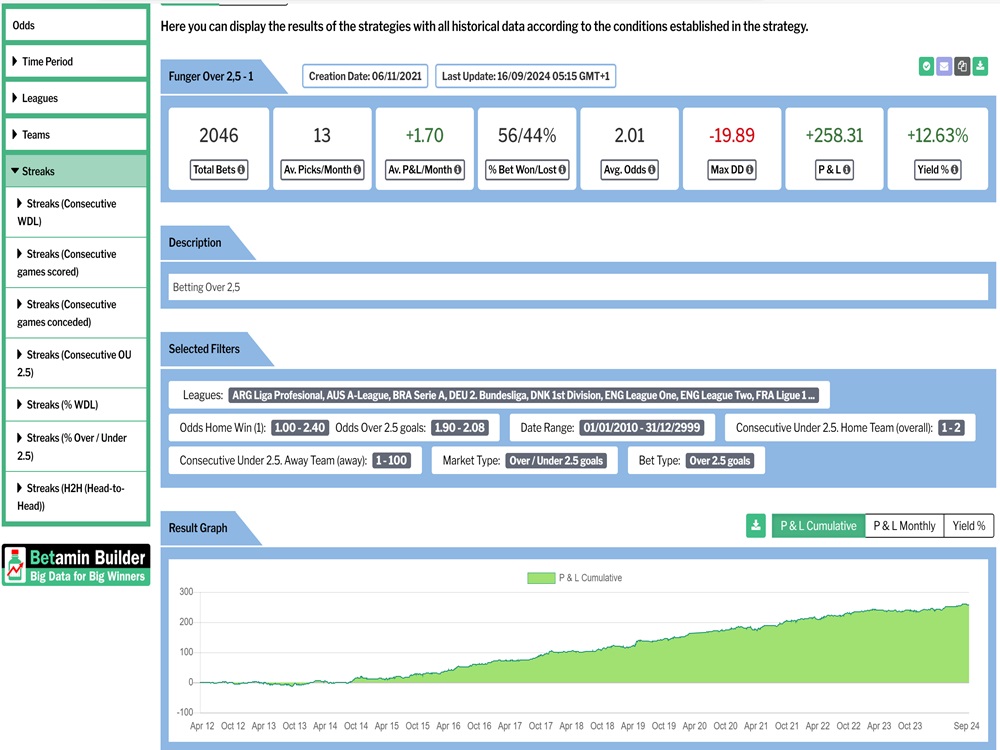 This service allows you to transform betting ideas, the kind that often sit at the back of your mind, into fully automated strategies. For example, you might wonder whether it’s profitable over the long term to back Over 2.5 Goals in matches where both teams have scored at least three goals across their previous three games. With Betaminic, you can back test that idea and see exactly what profit or loss it would have produced had you been using it over the past decade.