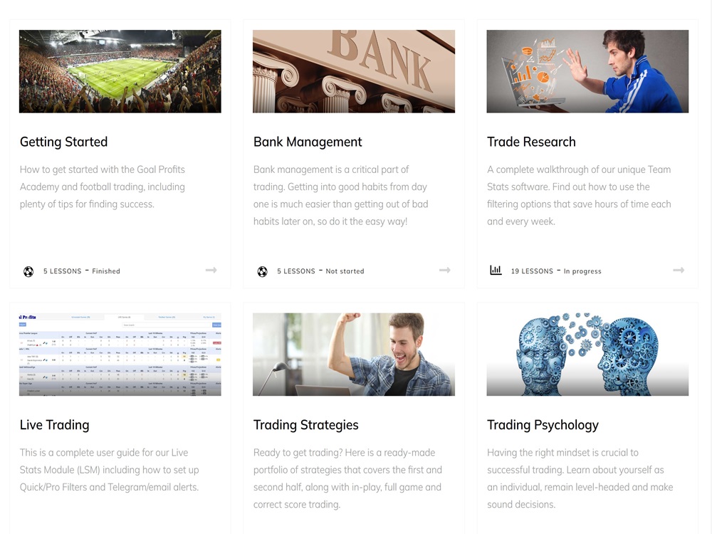 The Goal Profits Academy is a comprehensive training course designed for both those who are new to football trading to those who just want to improve their game. The course content is very well written & is divided into modules allowing the reader to digest in smaller chunks. The training material tracks your progress making it extremely easy to pickup from where you left off. The content is split into the following core modules & further divided into individual lessons: