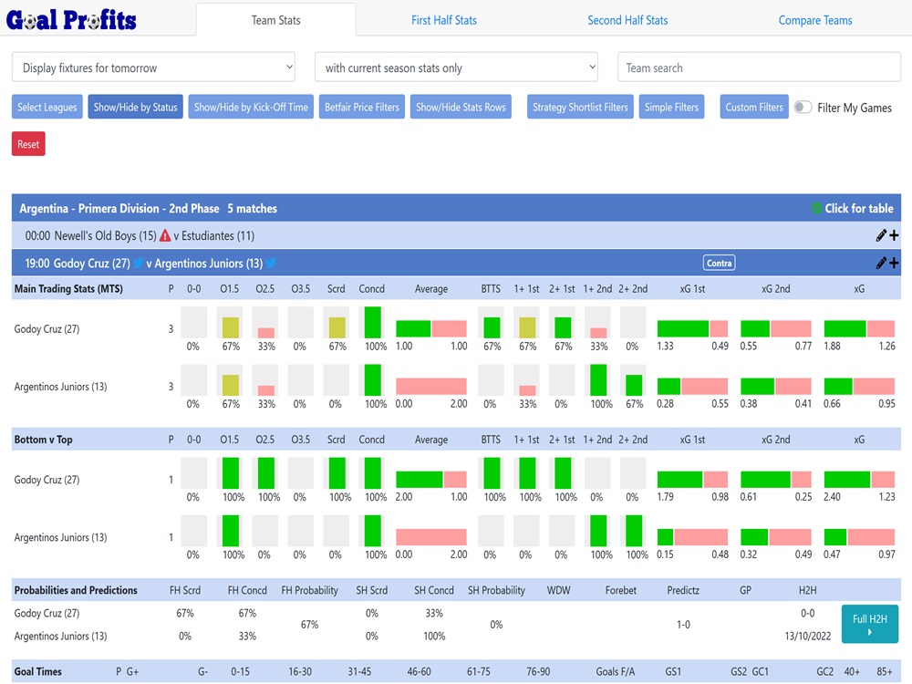 One of the interesting features of Team Stats is the strategy filters. There are set filters available for each of the Goal Profits strategies covered in the Goal Profits Academy. The provide you with shortlists for games that “might” be suitable for particular trade types. The team are keen to stress that these are shortlists & not selections & that extra research is need for each before they become picks. Team Stats is very easy to use & it won’t take you long before you are turning your ideas into match shortlists.