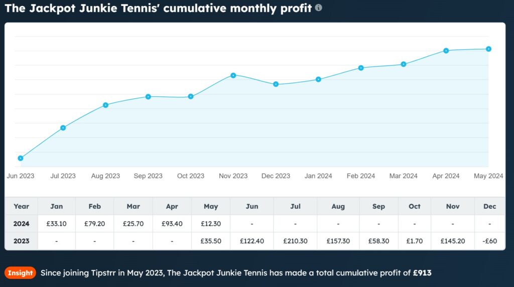 It’s the data in the following screenshot that is most exciting about this service. We always look for a smooth & consistent upward monthly profit trend which Jackpot Junkie Tennis certainly has but amazingly there has been just a single losing month in 13. If you want a consistent service then you will not get much better than this. All tips for Jackpot Junkie Tennis are verified by Tipstrr.