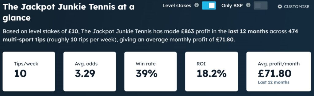 For this Jackpot Junkie Tennis review we will be using a £1000 betting bank placing 1% per selection advised.