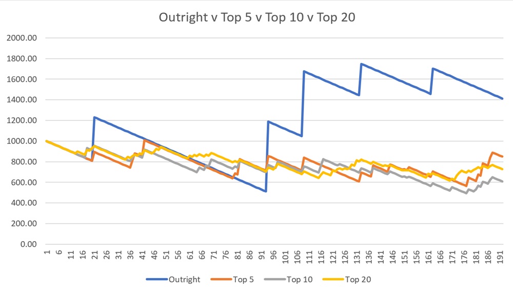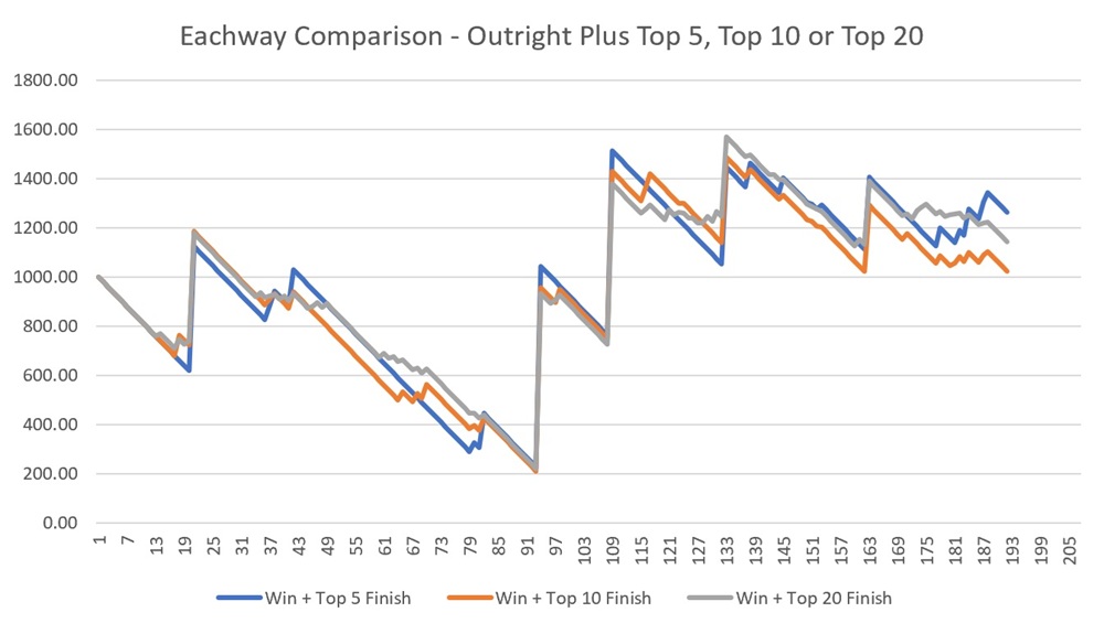 When backing Outright Wins in Golf you are backing huge prices so you need expect lengthy losing runs. Including the Place markets reduces the number of weeks without a winning bet which is good for the mindset so if you intend to follow this service I suggest you gather more data on the Place markets. The graph below provides a visual comparison of the different market types.