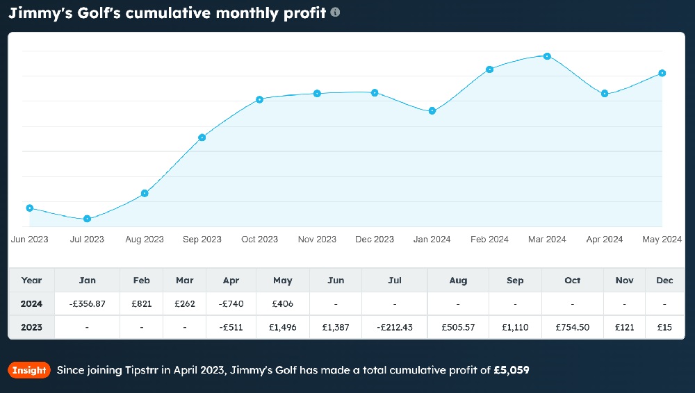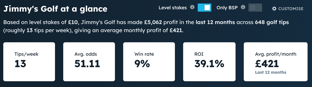 Jimmy’s Golf on Tipstrr is a selection service that has caught our attention in recent weeks. Tipstrr release a quarterly “Best Tipsters in Other Sports” award and the winner of this for 20024 Q1 was… You guessed it; Jimmy’s Golf. Looking at the stats, the service has secured a massive £4,653 for subscribers to £10 level stakes in its 13 months of operation. Members have enjoyed a nice 32.2% return on investment if they have been around from the start. Playing such huge odds is a long game. With a low strike rate, long losing runs are to be expected but when the winners come they are worth the wait so if you join following reading this post you should plan to be in it for the long haul. Here are some of the remarkable stats for Jimmy’s Golf shown by Tipstrr…